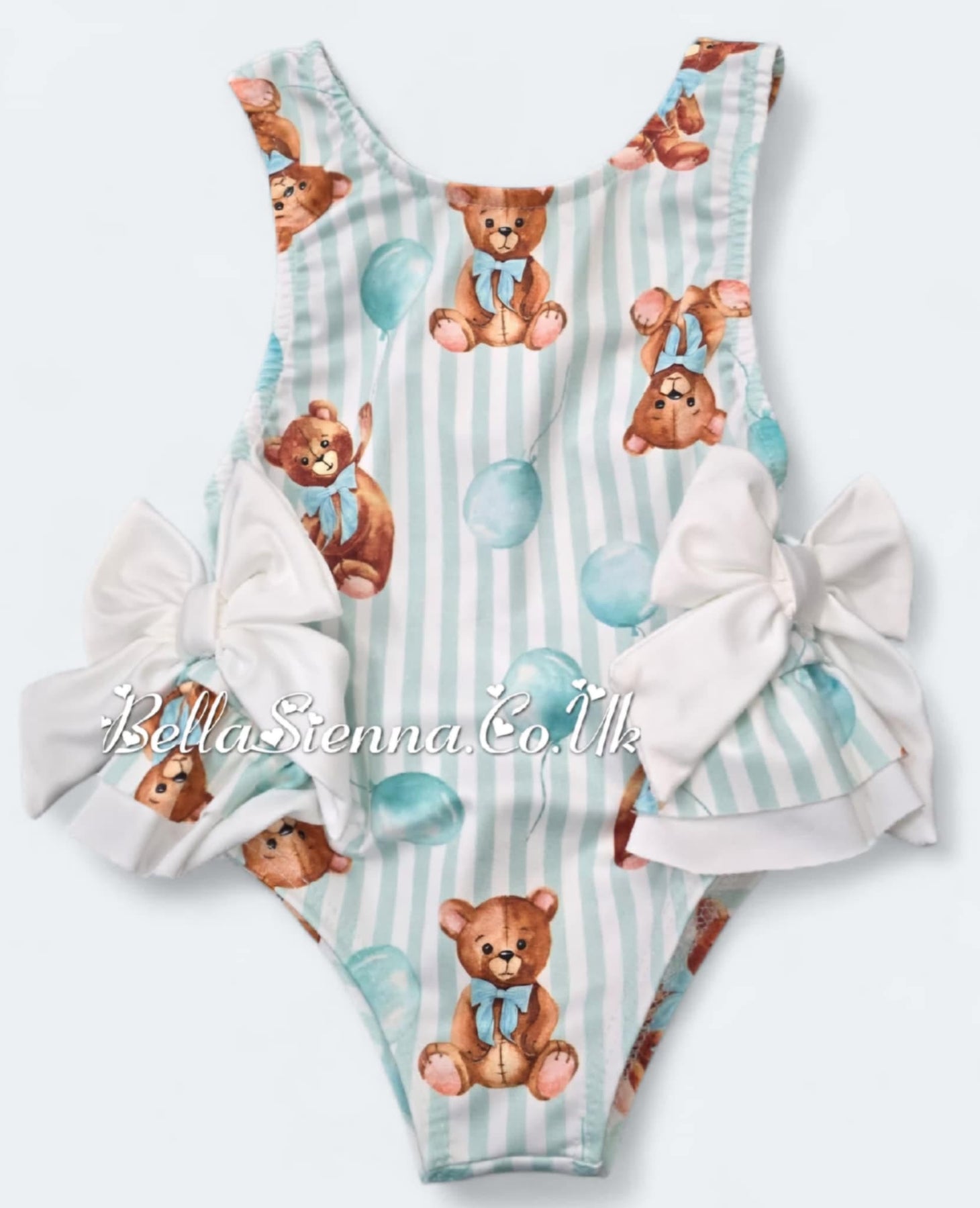 Baby Girls Mint Green "Teddy Bear" Swimsuit With Bows - Swimming Costume