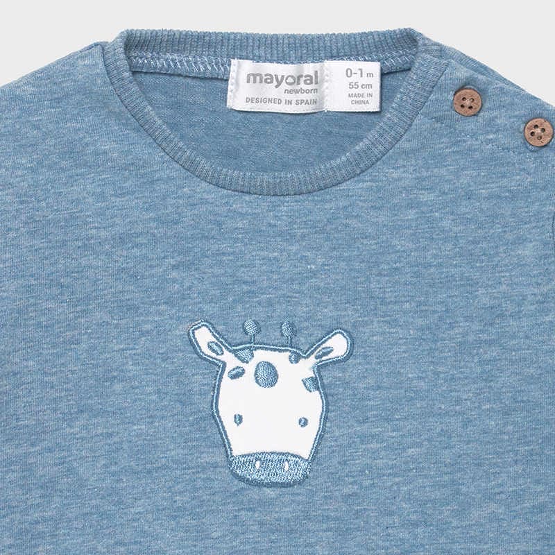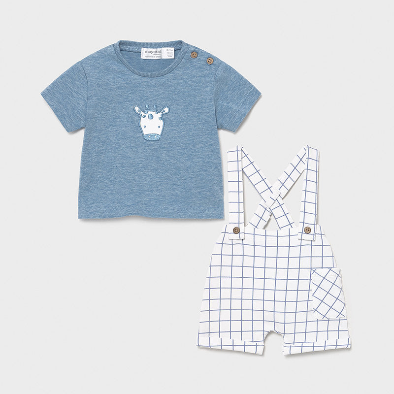 Mayoral Boys Two Piece T-Shirt & Dungaree Set! This traditional set with its blue t-shirt with an embroidered Giraffe, plus the dungarees are made in white and blue check and button fastening for a secure fit.