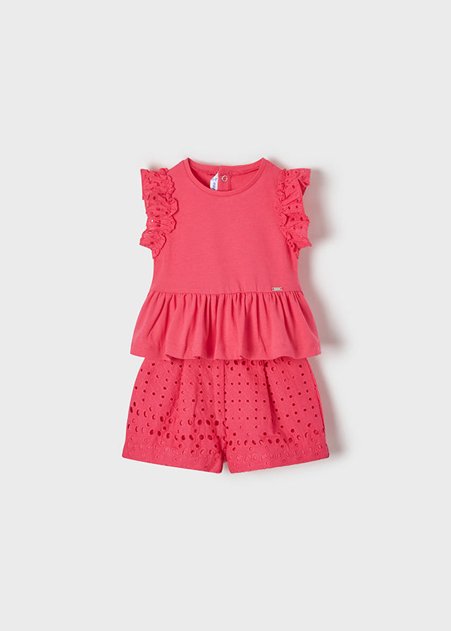 Mayoral's Perforated Bermuda Shorts set. With an eye-catching fuchsia and baby rose option, these shorts are perfect for any summer activity. Crafted with breathable fabric, they offer comfort and style with a perforated design.