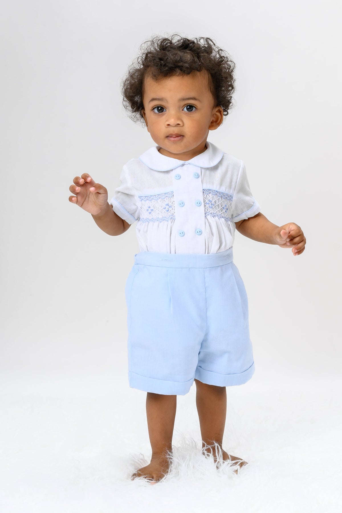 This charming boys 2-piece set is the perfect blend of traditional style and modern comfort, ideal for the spring and summer seasons. The crisp white shirt features a timeless Peter Pan collar and delicate hand-smocking along the front. The shirt is paired with lemon shorts that are not only stylish but also practical, attaching at the waist with buttons for a secure fit. Decorative buttons on the shirt add an extra pop of detail, making this set perfect for any formal or semi-formal occasion. A classic choice for the best-dressed little gentleman.