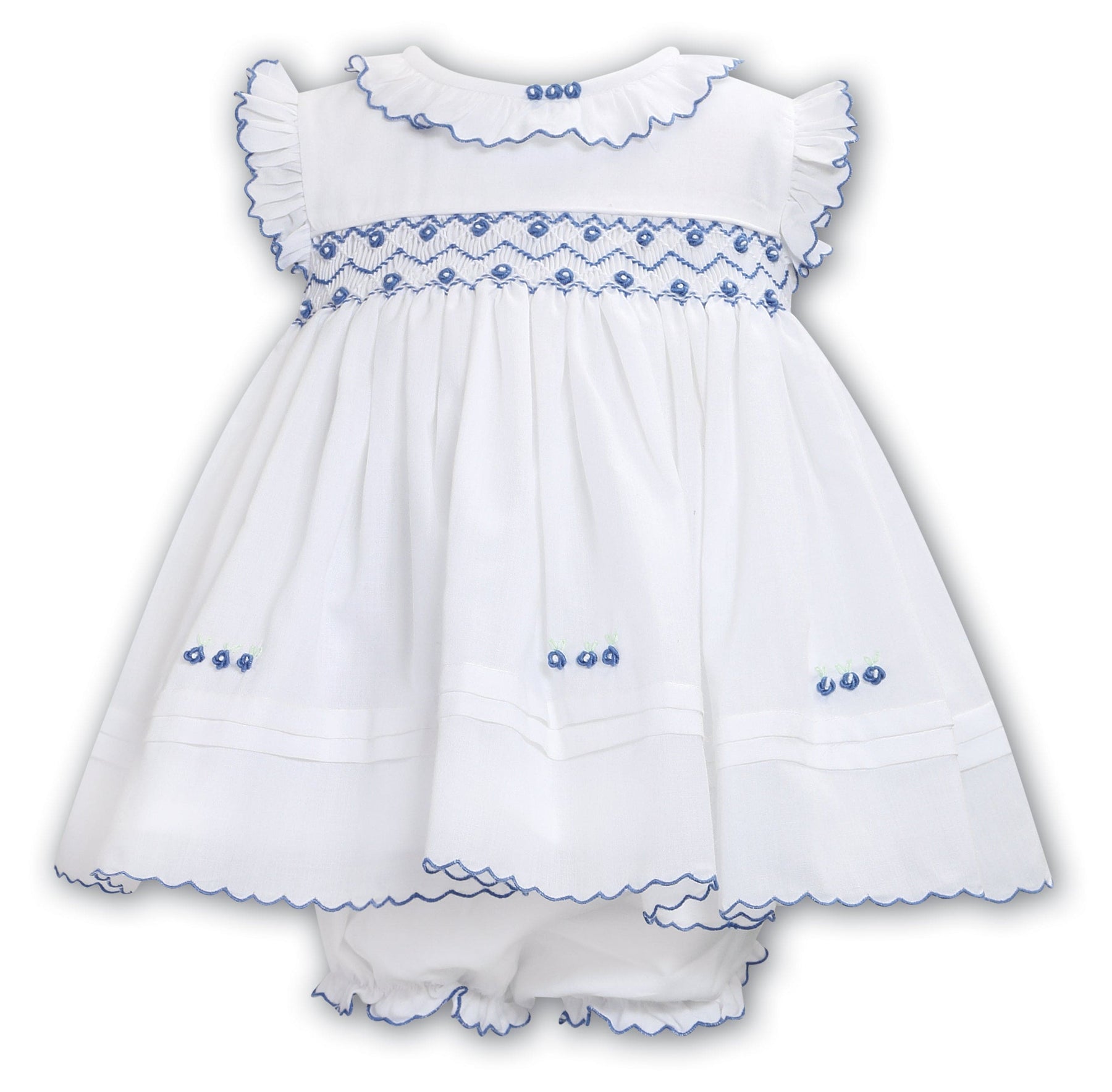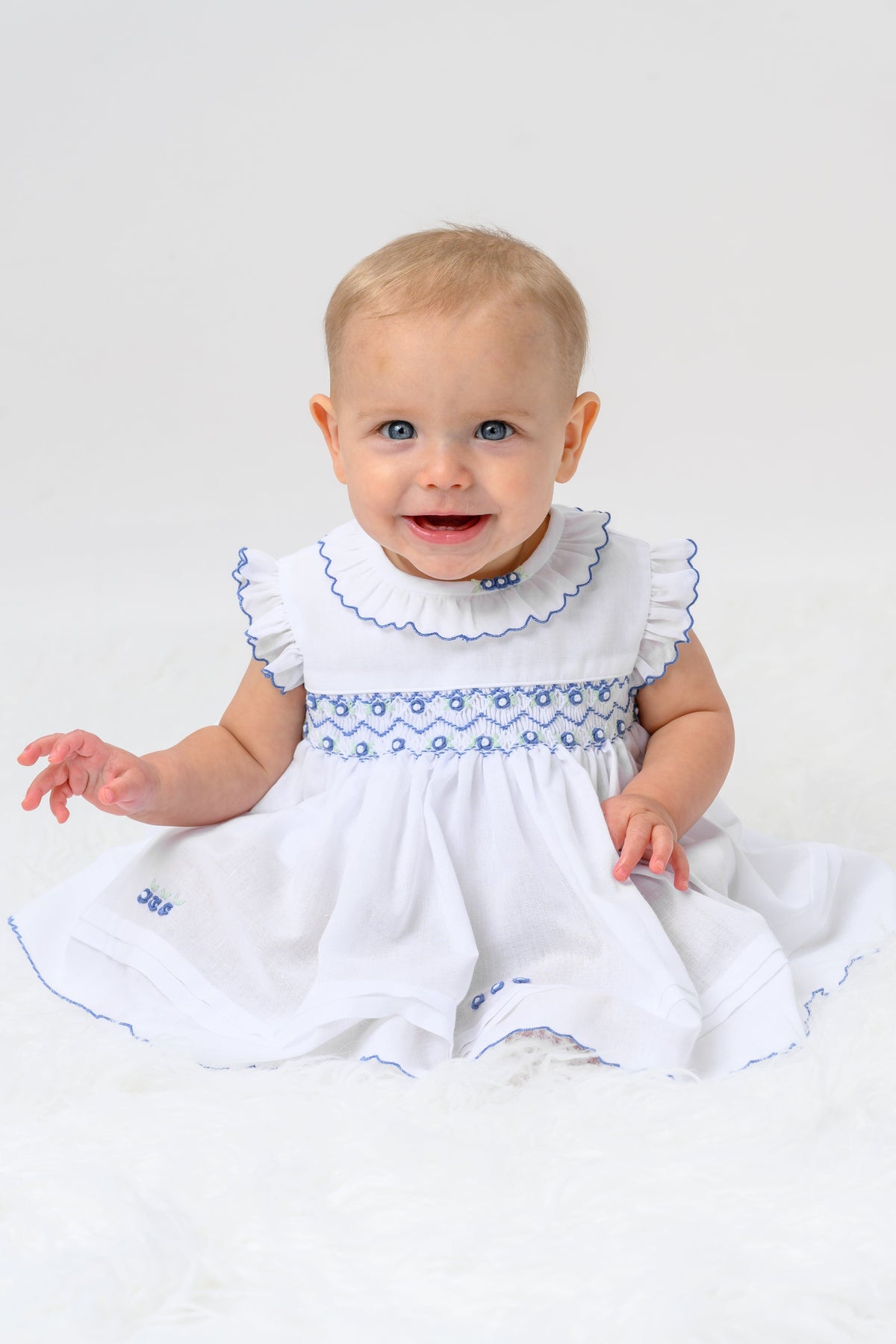 Sarah Louise White & Cornflower Blue Hand Smocked Dress & Pants Set - 013652