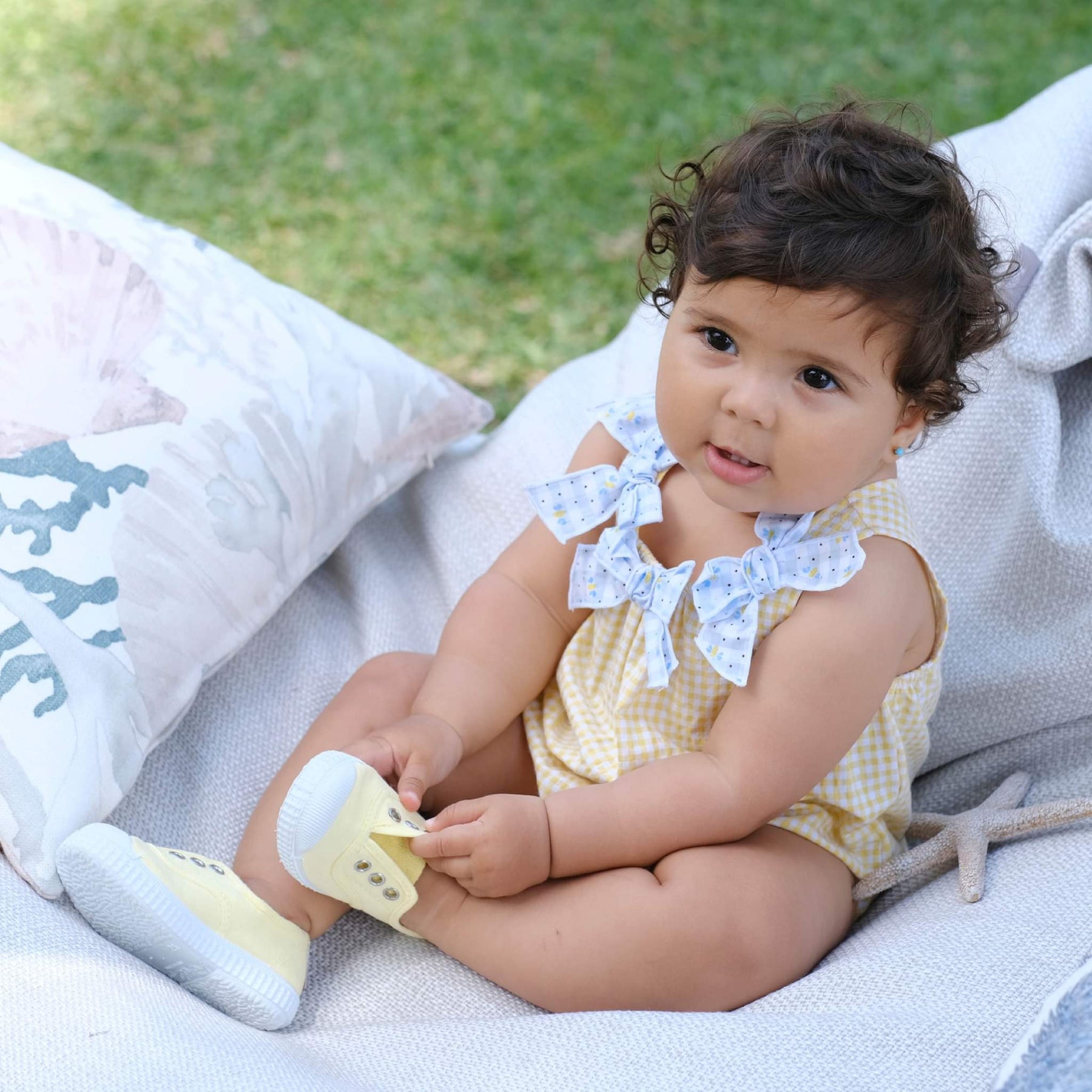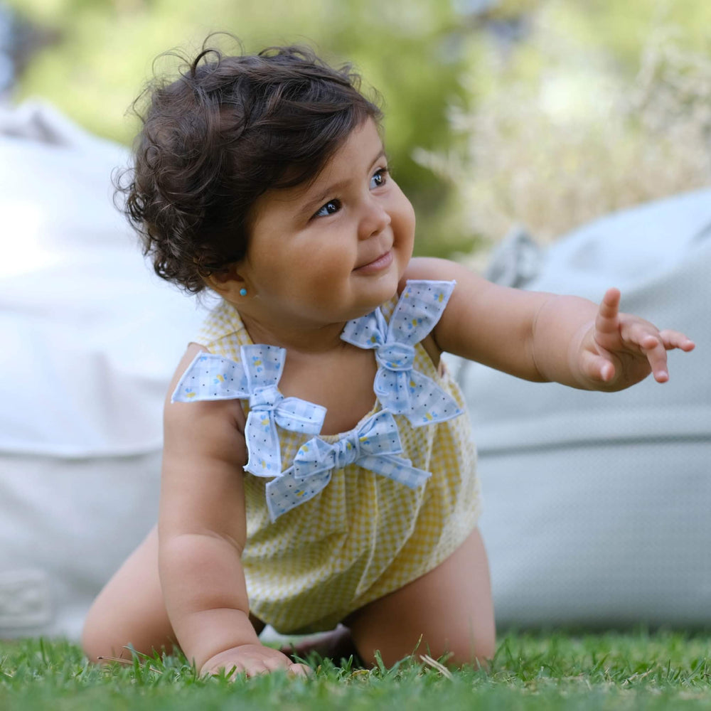 Tutto Piccolo Lemon check seersucker Romper Shortie makes a perfect summer outfit. Crafted with quality natural cotton enhanced with a seersucker and yellow gingham print, it features decorative bows on the front, buttons at the back and between the legs for easy changing.