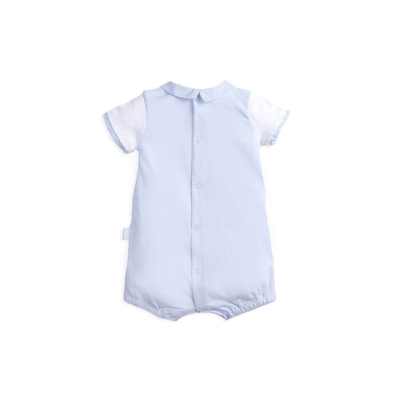 Plain short-sleeved romper in white and sky blue combined with sky blue gingham print. Embroidered teddy bear. Back and crotch opening with pressure buttons.