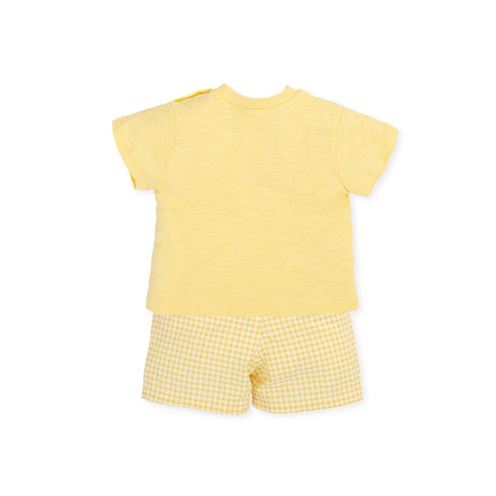 Tutto Piccolo Yellow Shorts & T-shirt Set. The t-shirt features a yellow hue, popper fastening and a pocket with an embroidered bumble bee. The shorts have a yellow check pattern and an elasticated waist for extra comfort.