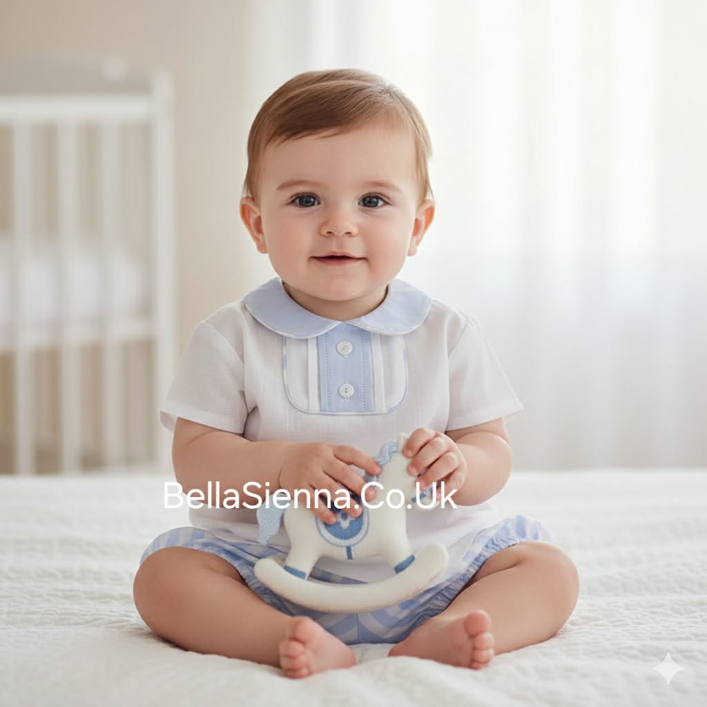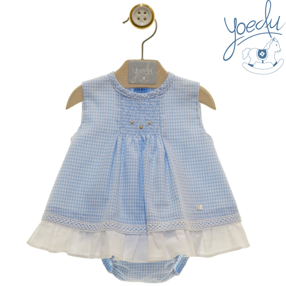 Yoedu Boys Blue & White Gingham Dungaree Set With Smocked Top - 0025