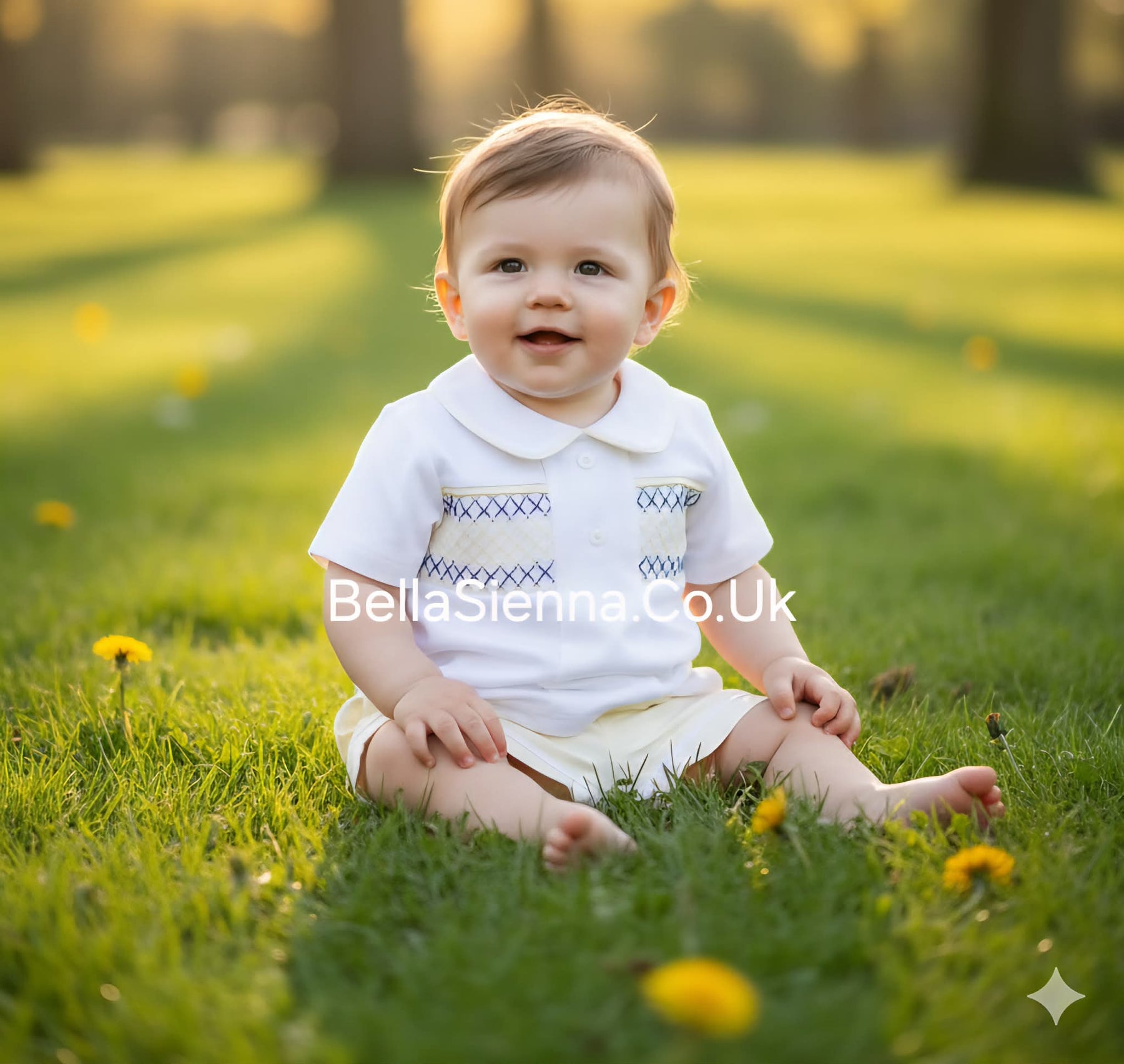 Lemon, White & Navy Cotton, Smocked Boys Shorts Set - SG111