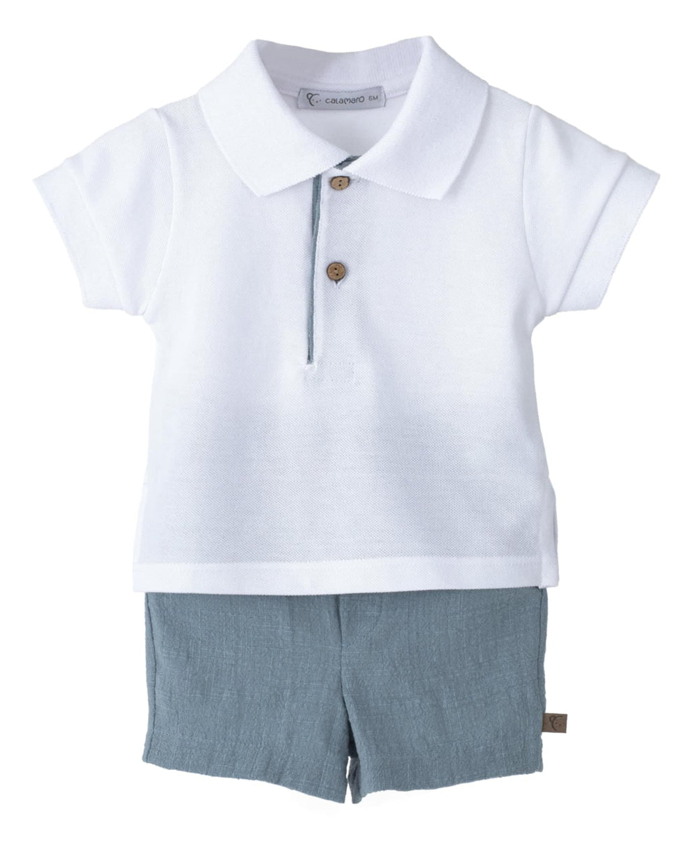 Calamaro Boys White & Green Shorts Set, crafted from breathable fabric. Featuring a white polo shirt and green linen shorts, coordinated look for boys. Perfect for casual wear.