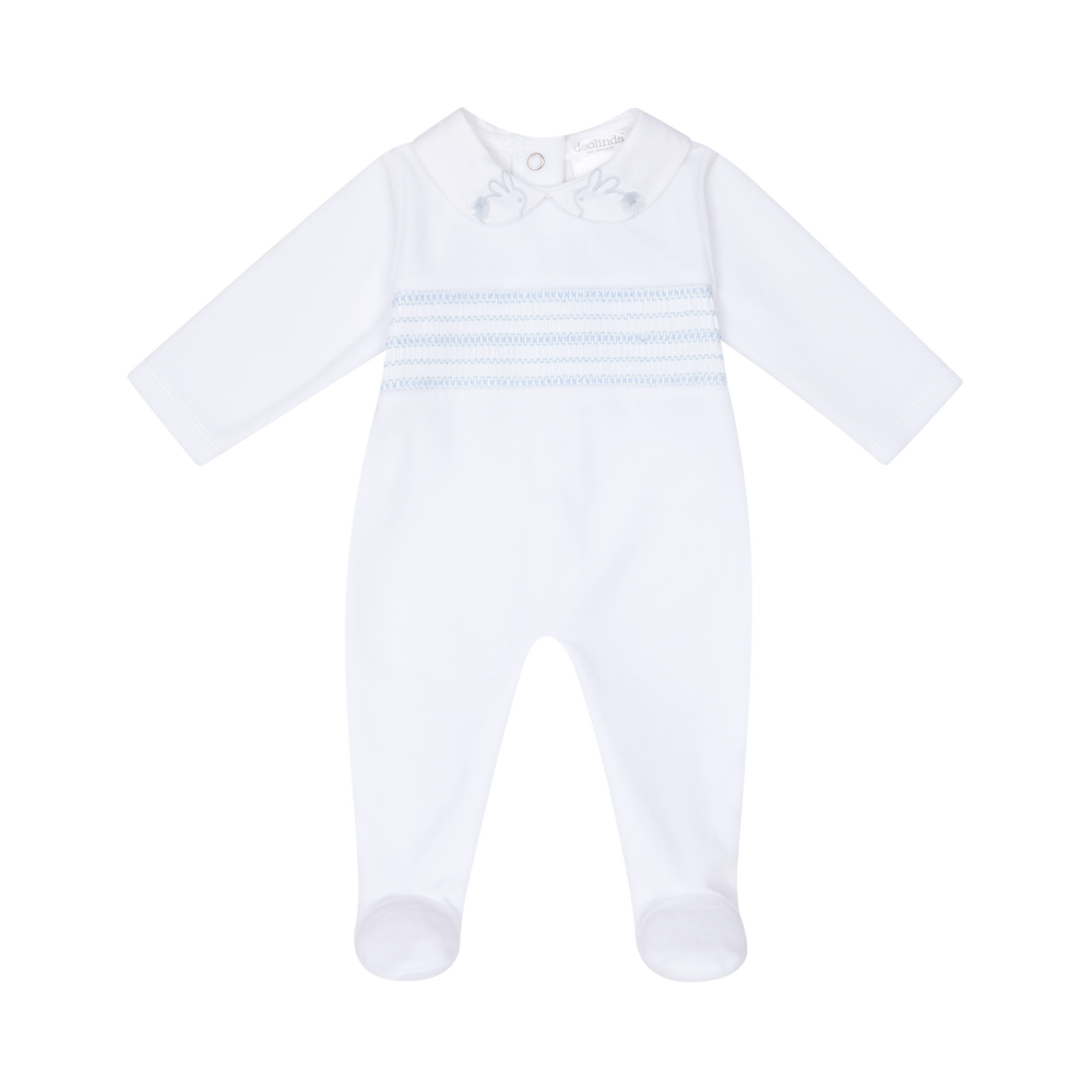 Deolinda Unisex Baby White & Blue Velour Smocked Baby grow With Embroidered Bunny Rabbits - DBI25130