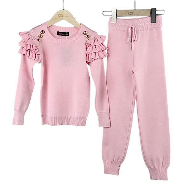 Girls pink two piece top with frilly ruffle shoulder and gold button detail paired with co-ord jogger lounge pants.
