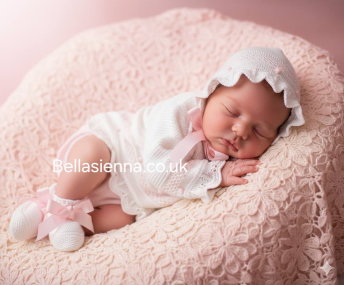 A truly beautiful four-piece set for baby girls set by Mac ilusion . With all items being made in a cotton blend, the white and pale pink knitted outfit consists of short-sleeve top, bloomers, bonnet and a pair of booties. The crocheted tee has a rounded neckline, long sleeves, buttons fasten to the back. The bloomers are pink they three have buttons either side which makes them easy to take off , whilst the bonnet ties at the chin. The booties have cute bow appliques.