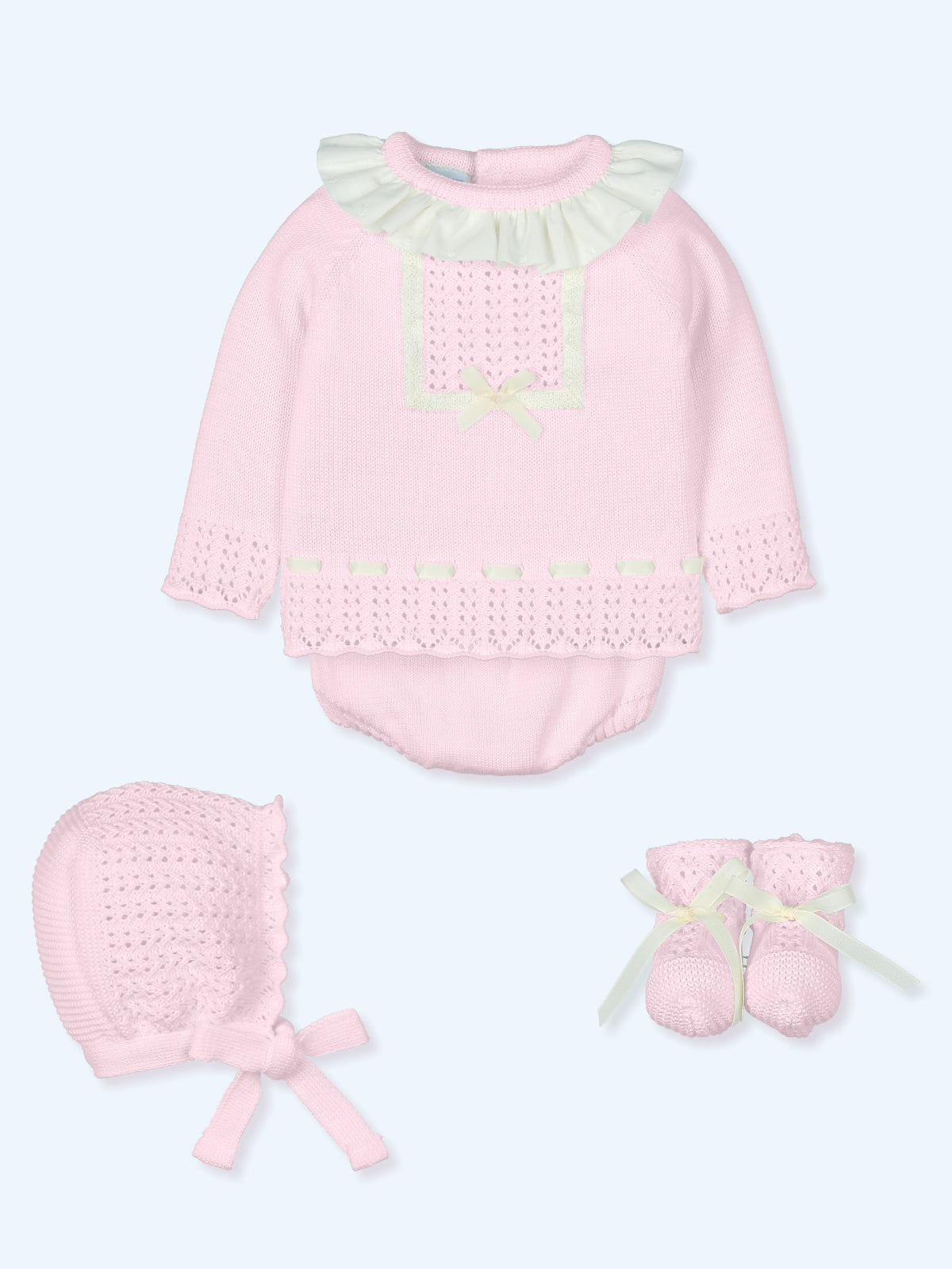 With all items being made in a cotton blend, knitted outfit consists of long-sleeve top, bloomers, bonnet and a pair of booties. The crocheted tee has a rounded neckline with ruffles, long sleeves, buttons fasten to the back.