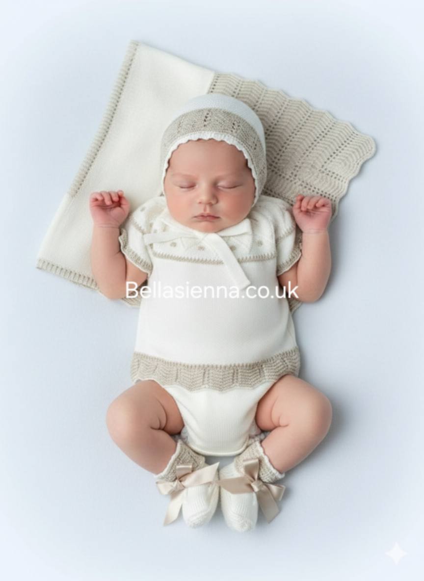 BABY FOUR-PIECE OUTFIT INCLUDES A SHORT-SLEEVED KNITTED SWEATER WITH CANESU, CULOTTE, BONNET AND BOOTIES. GLOSSY