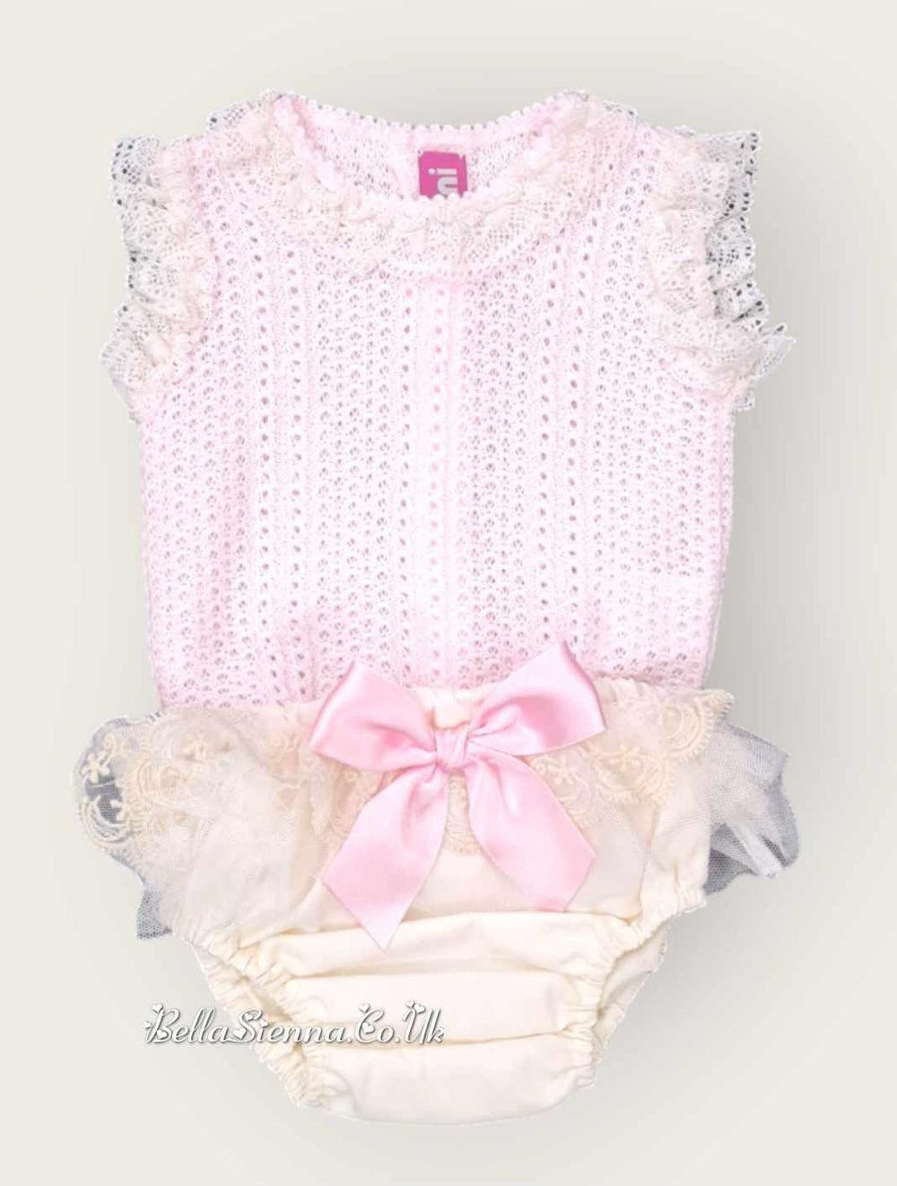 Nini Baby Girls Fine Pink And Cream Knit Summer Set With Lace