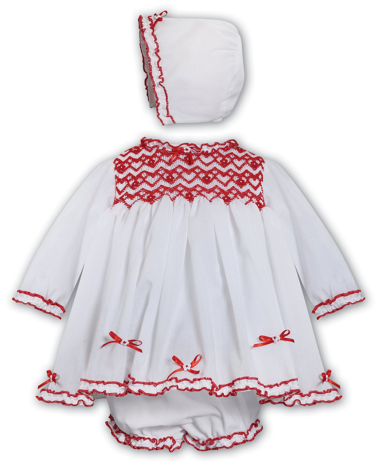 Sarah Louise White & Red Hand Smocked Dress, Pants & Bonnet Set - 013782