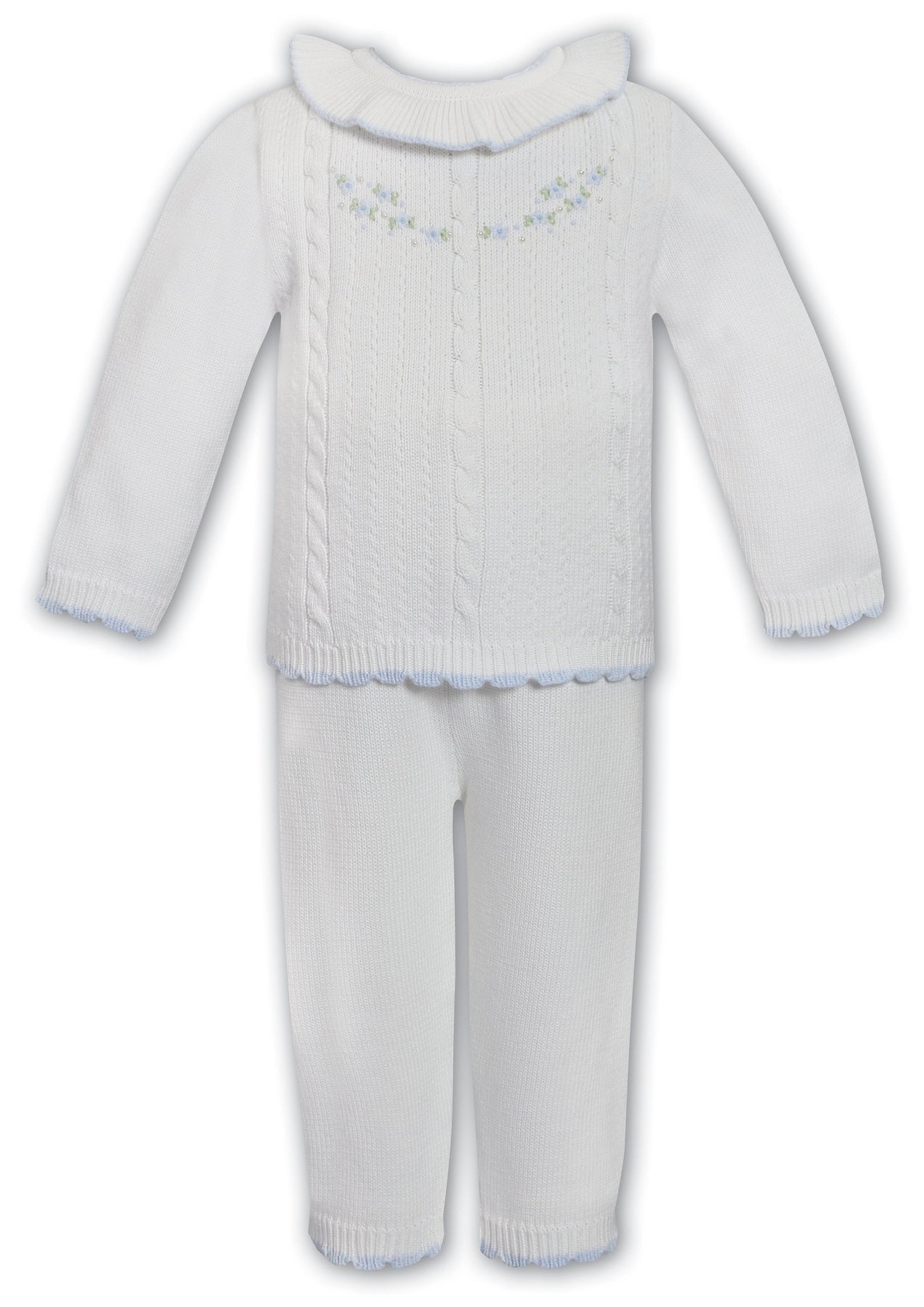 Sarah Louise Ivory & Blue Hand Embroidered Knitted Two Piece Set - 013741