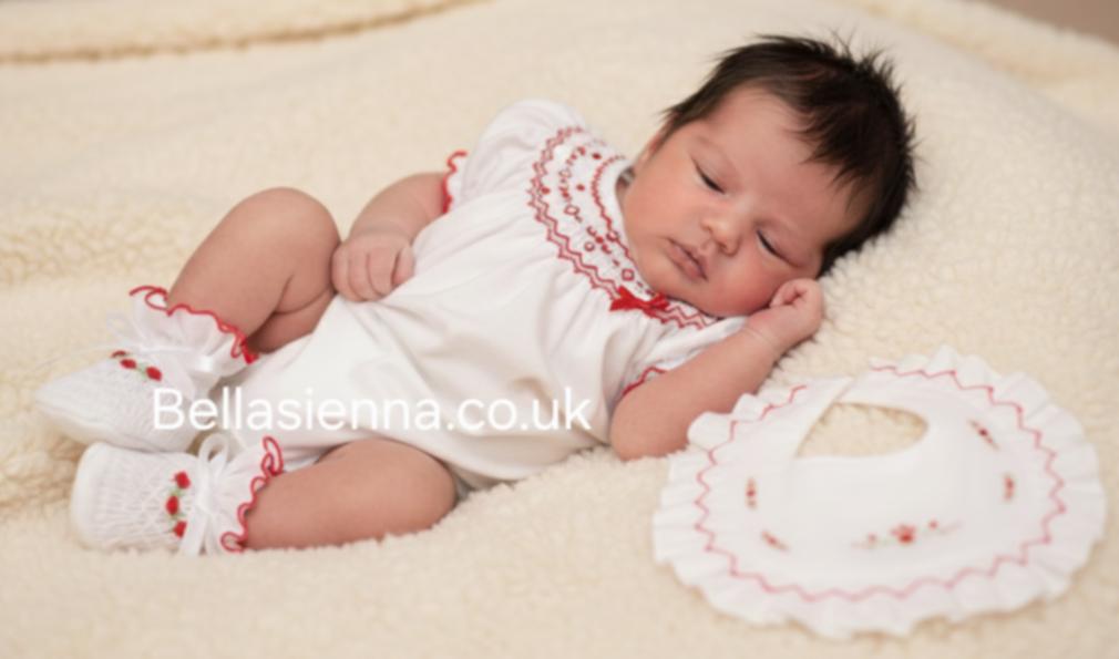Our Heritage Line Short Sleeve Bubble in , a beautiful white/red colourway, our signature hand-smocking with delicate hand-embroidered Flowers and a Satin Bow.